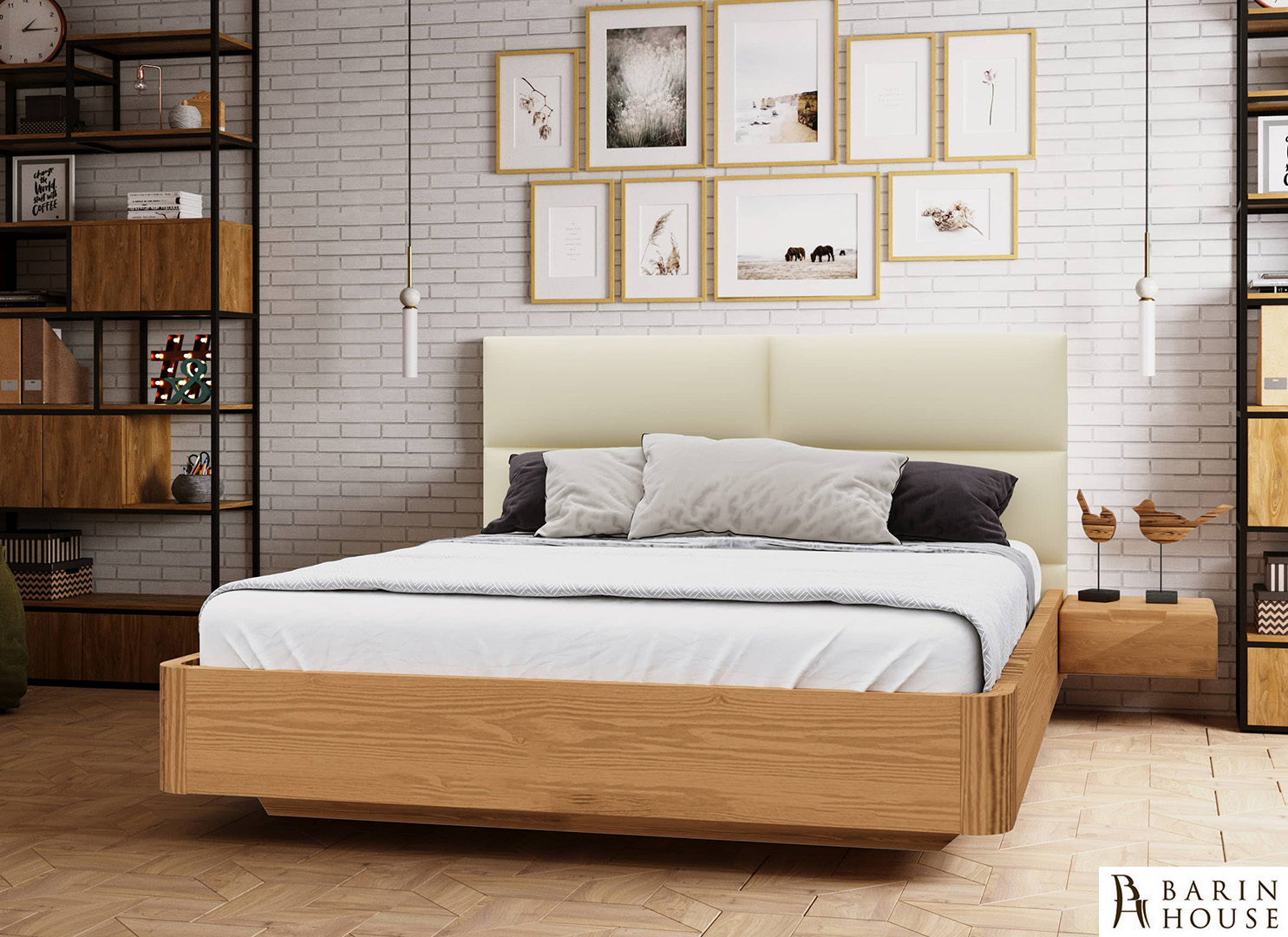 Функциональность кровати дополняет навесная прикроватная тумба, которая визуально облегчает конструкцию и создаёт эффект парения. Такое решение не только экономит пространство, но и делает интерьер более современным и аккуратным.