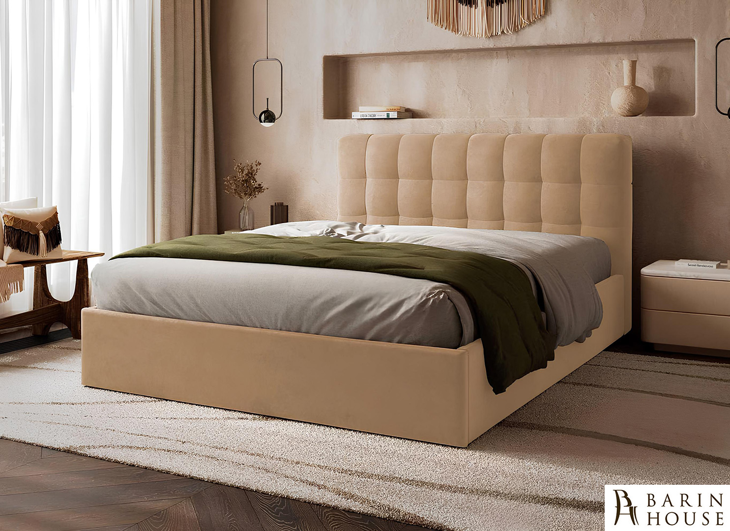 Каркас кровати выполнен из прочных, долговечных материалов, что гарантирует стабильность и надёжность конструкции на протяжении многих лет. Обивка из премиальной велюровой ткани придаёт поверхности бархатистую мягкость и элегантный вид, а приятная на ощупь текстура усиливает ощущение комфорта и тепла.