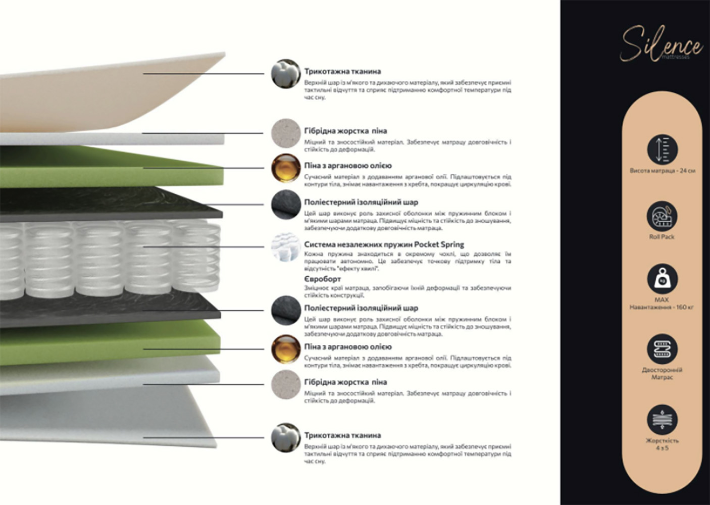 Чехол из мягкой трикотажной ткани обеспечивает приятные тактильные ощущения и свободную циркуляцию воздуха. В наполнении используются гибридные жёсткие пены, которые поддерживают позвоночник в анатомически правильном положении, и инновационная пена с аргановым маслом, известная своими восстанавливающими и антиоксидантными свойствами, создающая дополнительный комфорт.