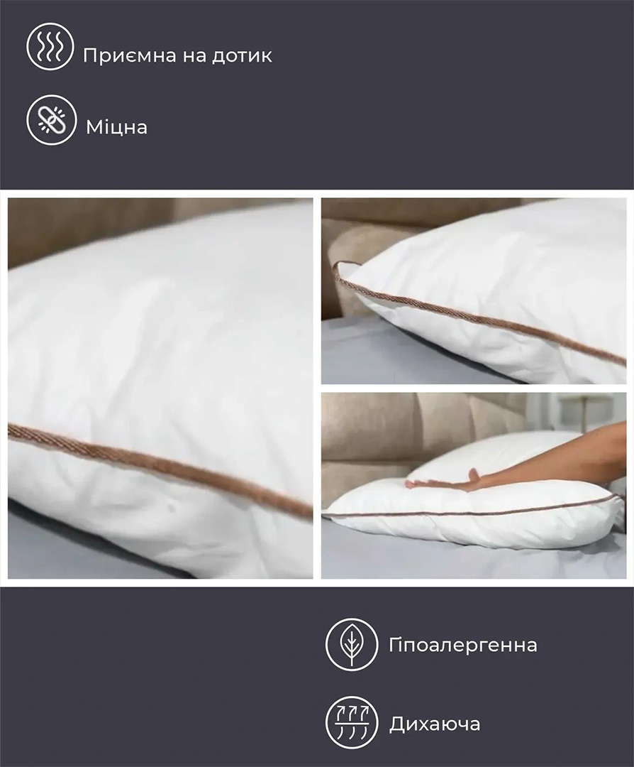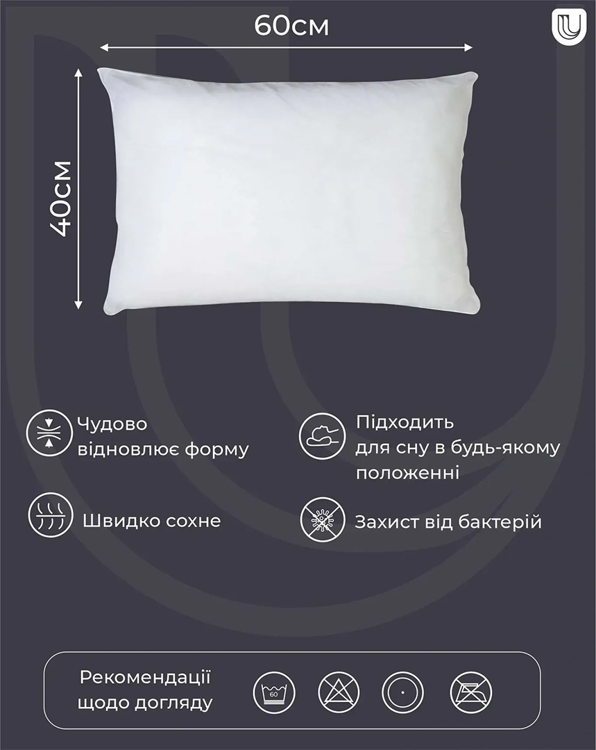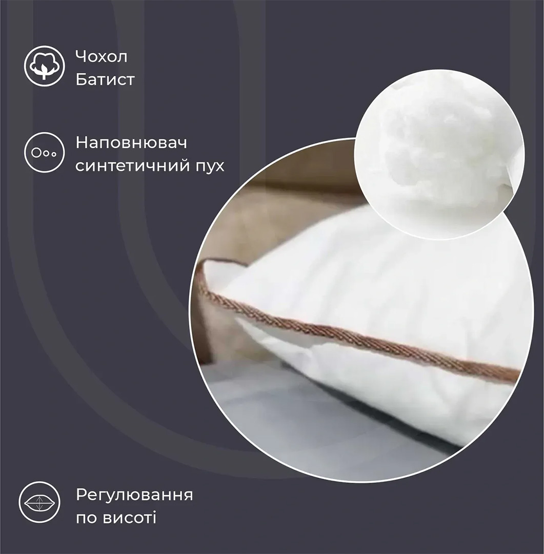 - Искусственный пух: легкий, упругий, сохраняет форму и обеспечивает правильную поддержку.