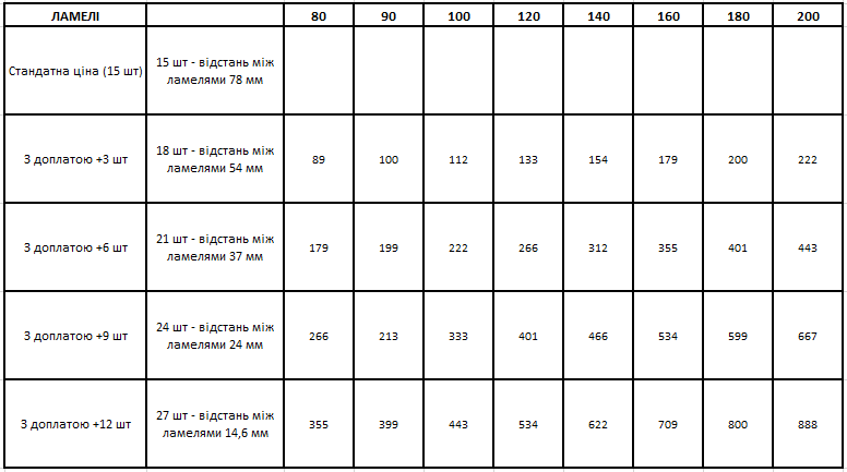 Доплата за комплектацію додатковими посиленими ламелями (грн):