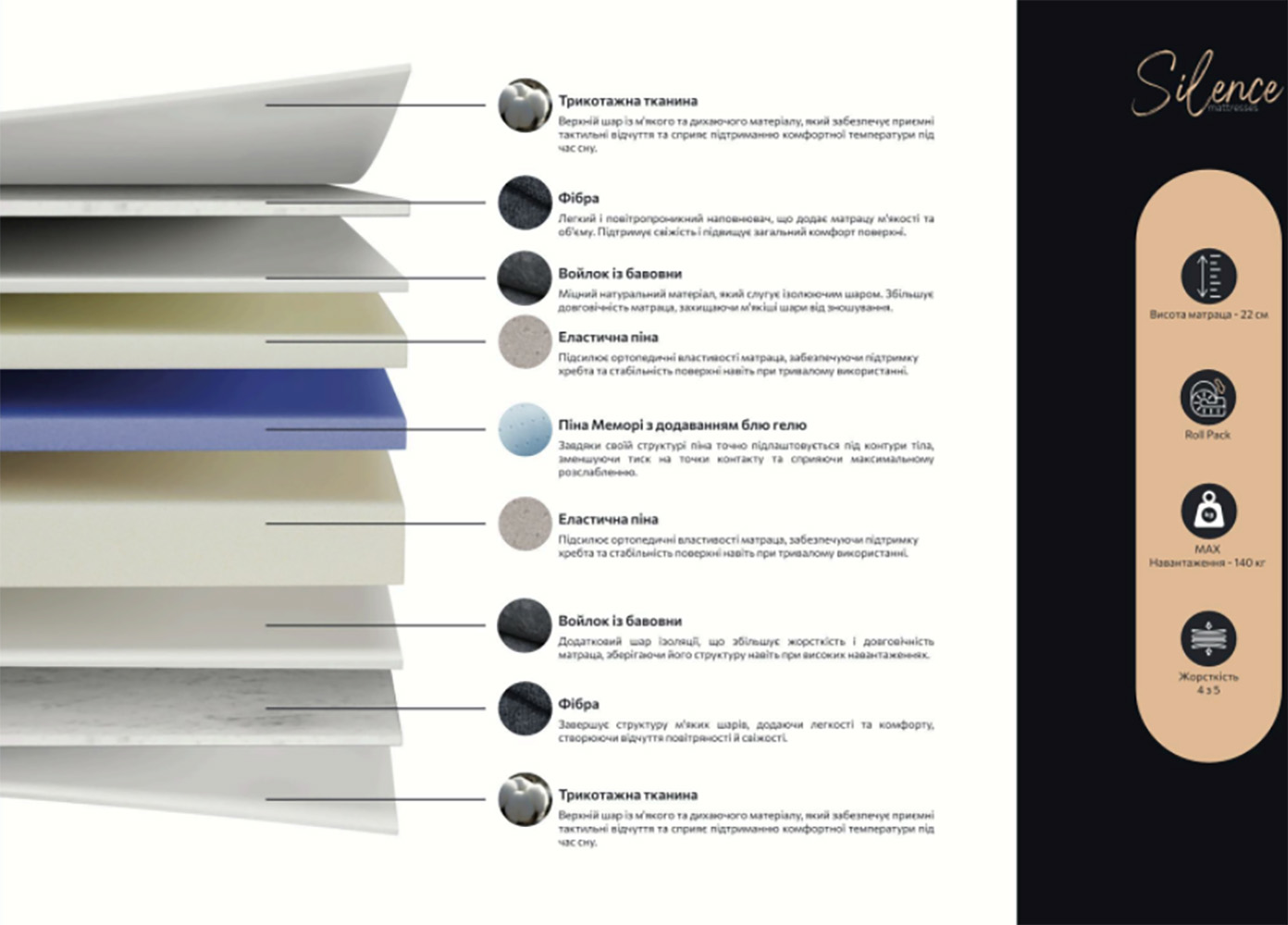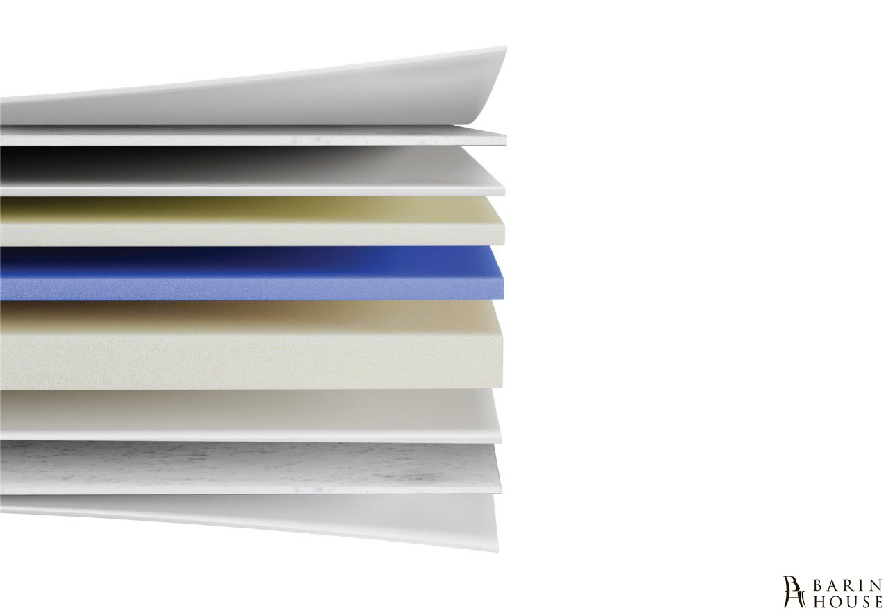 Чохол з трикотажної тканини і шари фібри створюють м'якість і приємну поверхню, а натуральна бавовняна повсть забезпечує додаткову міцність і природну вентиляцію. Еластична піна підтримує тіло у правильному положенні, а сучасна Memory Foam з Blue Gel дбайливо підлаштовується під індивідуальні вигини, знімаючи навантаження з хребта та суглобів та створюючи ефект легкого охолодження.