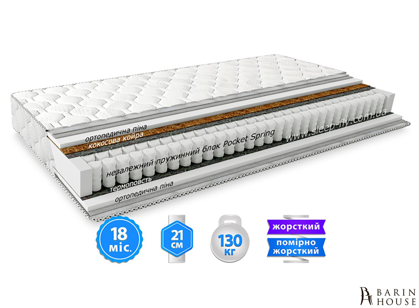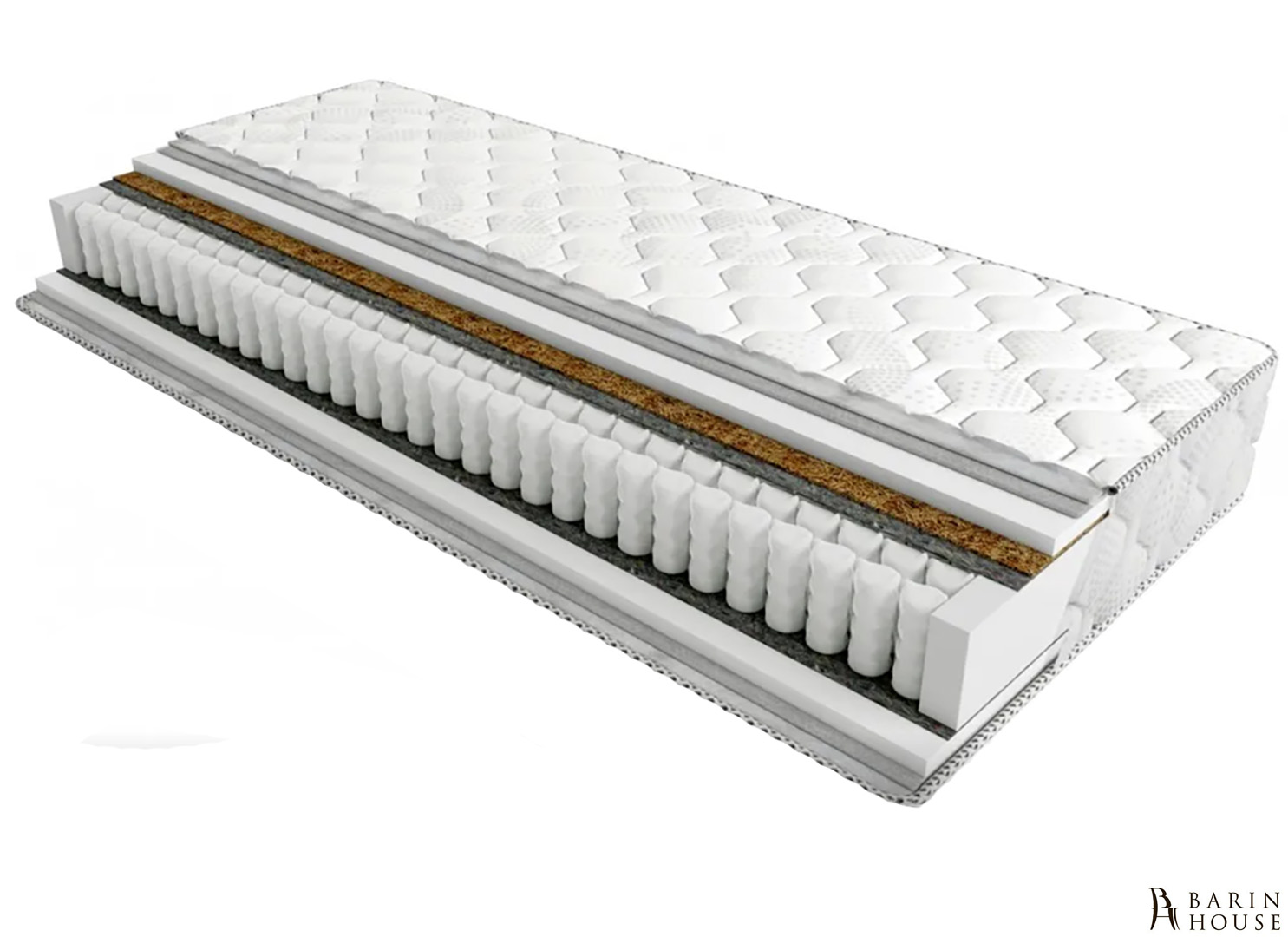 По обидва боки пружинний блок надійно захищений шарами термоповсть - міцного і довговічного матеріалу, який збільшує термін служби матраца і підтримує його форму. Комфортні шари з еластичної піни створюють м'якість і затишок, а натуральна латексована кокосова койра надає додаткову жорсткість і відмінну вентиляцію, роблячи матрац особливо придатним для людей, які віддають перевагу помірно-жорсткому місці.